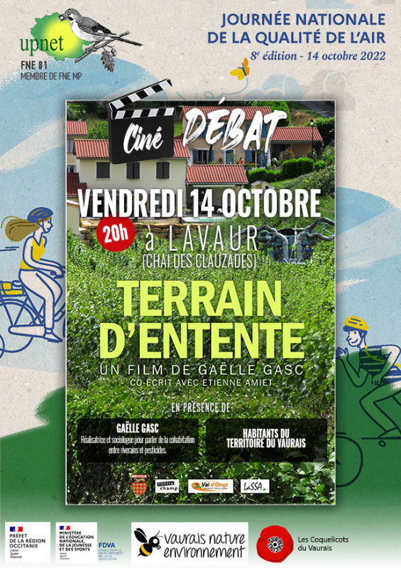 Dans le cadre de la "Journée Nationale de la Qualité de l'Air 2022", l'UPNET (FNE 81) et les associations locales du Vaurais adhérentes, organisent une Soirée CINE - DEBAT : film "TERRAIN D'ENTENTE" qui aura lieu à 20H